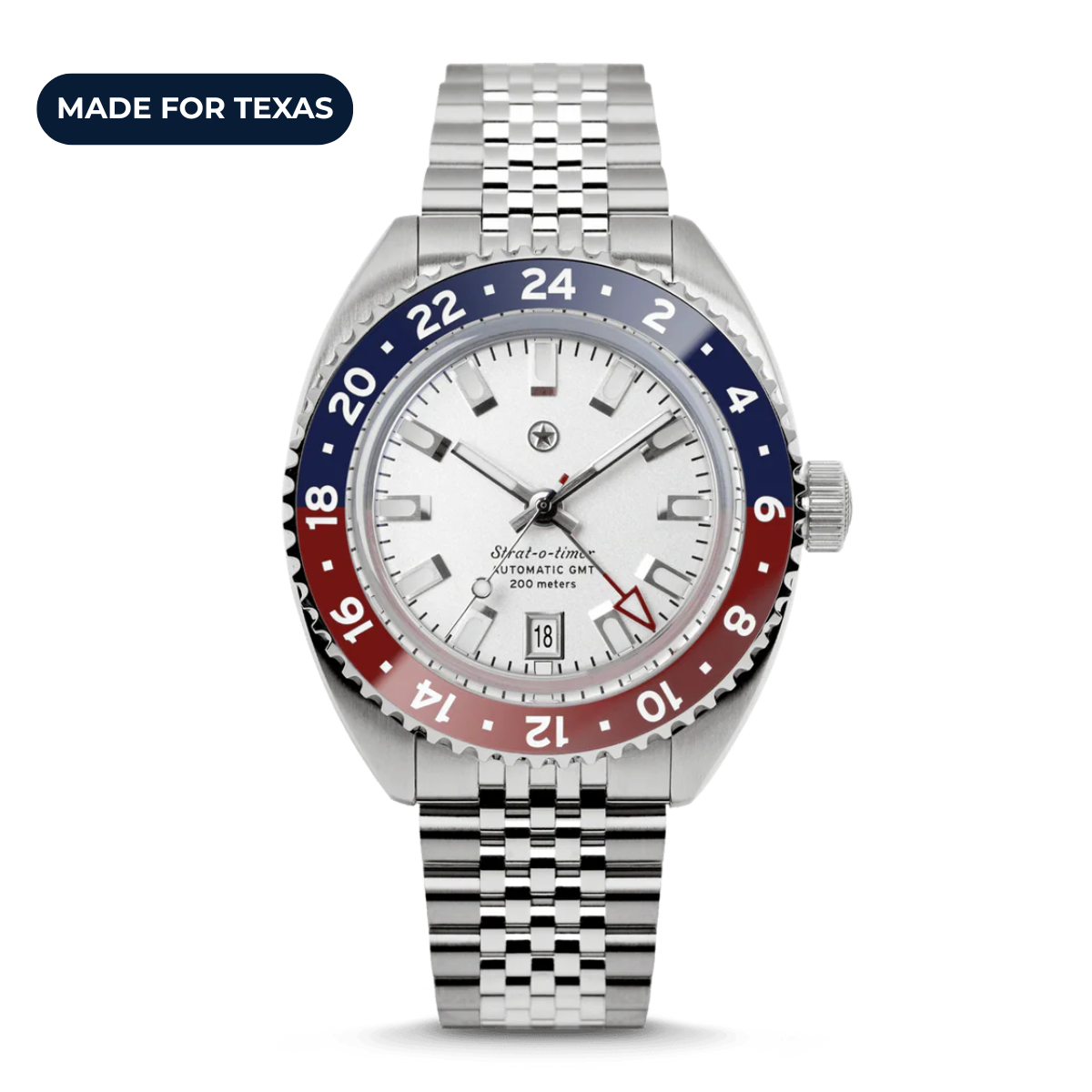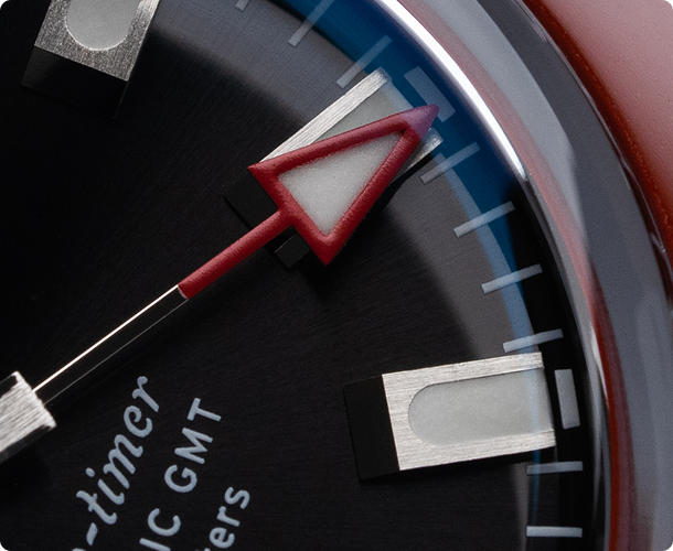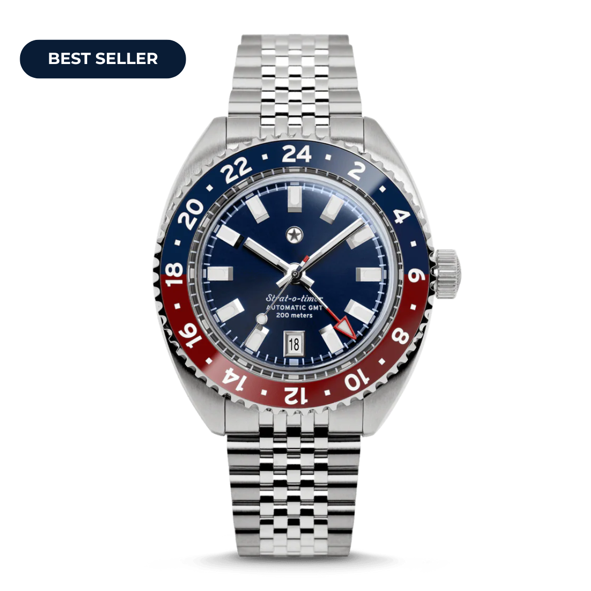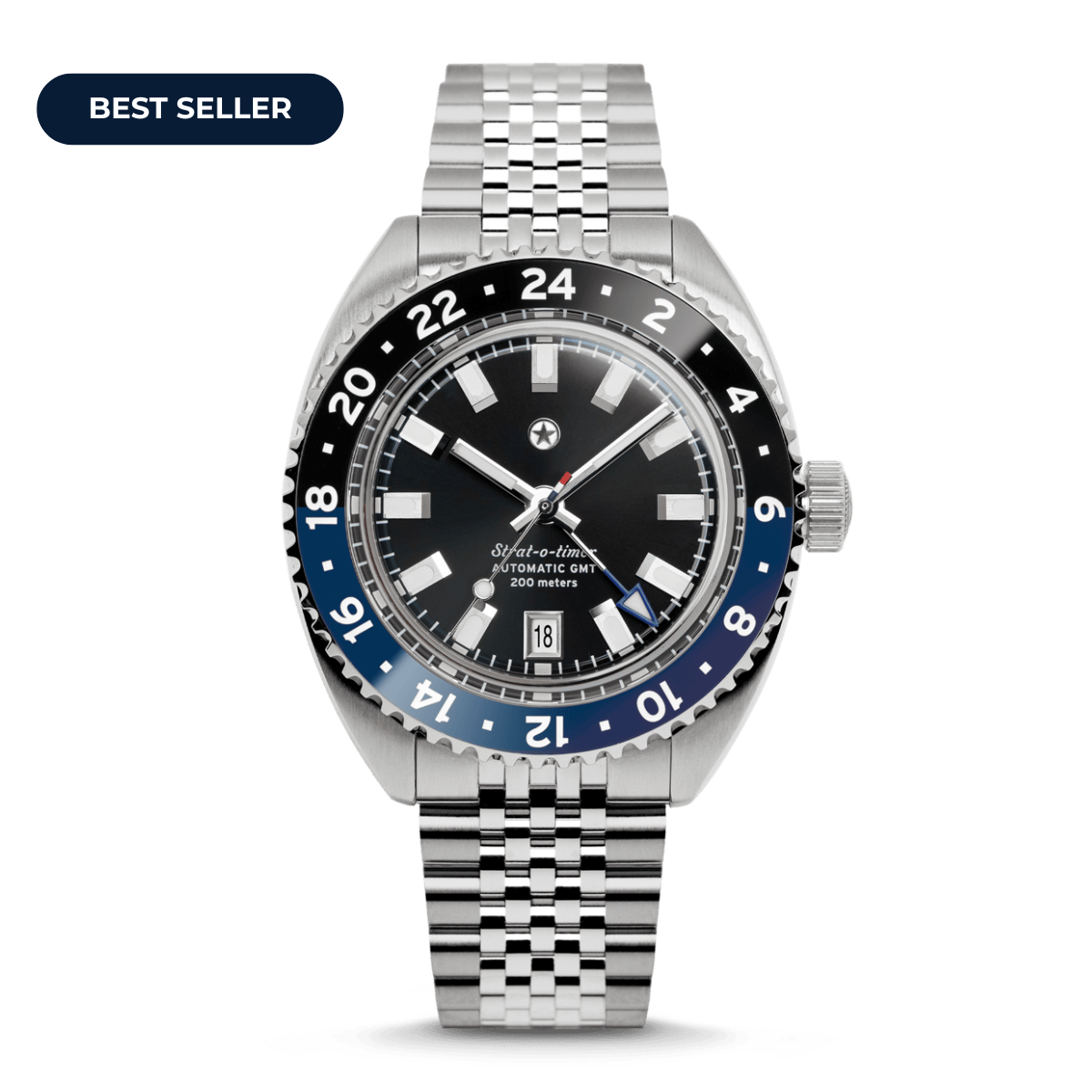 Most GMTs under $1,500 use "caller" movements—you can't adjust the local hour independently. The Strat-o-timer houses the Miyota 9075, a true traveler's GMT with a jumping hour hand. Set your home time on the 24-hour hand, then adjust local time without stopping the watch. The same functionality found in the Rolex GMT-Master II.