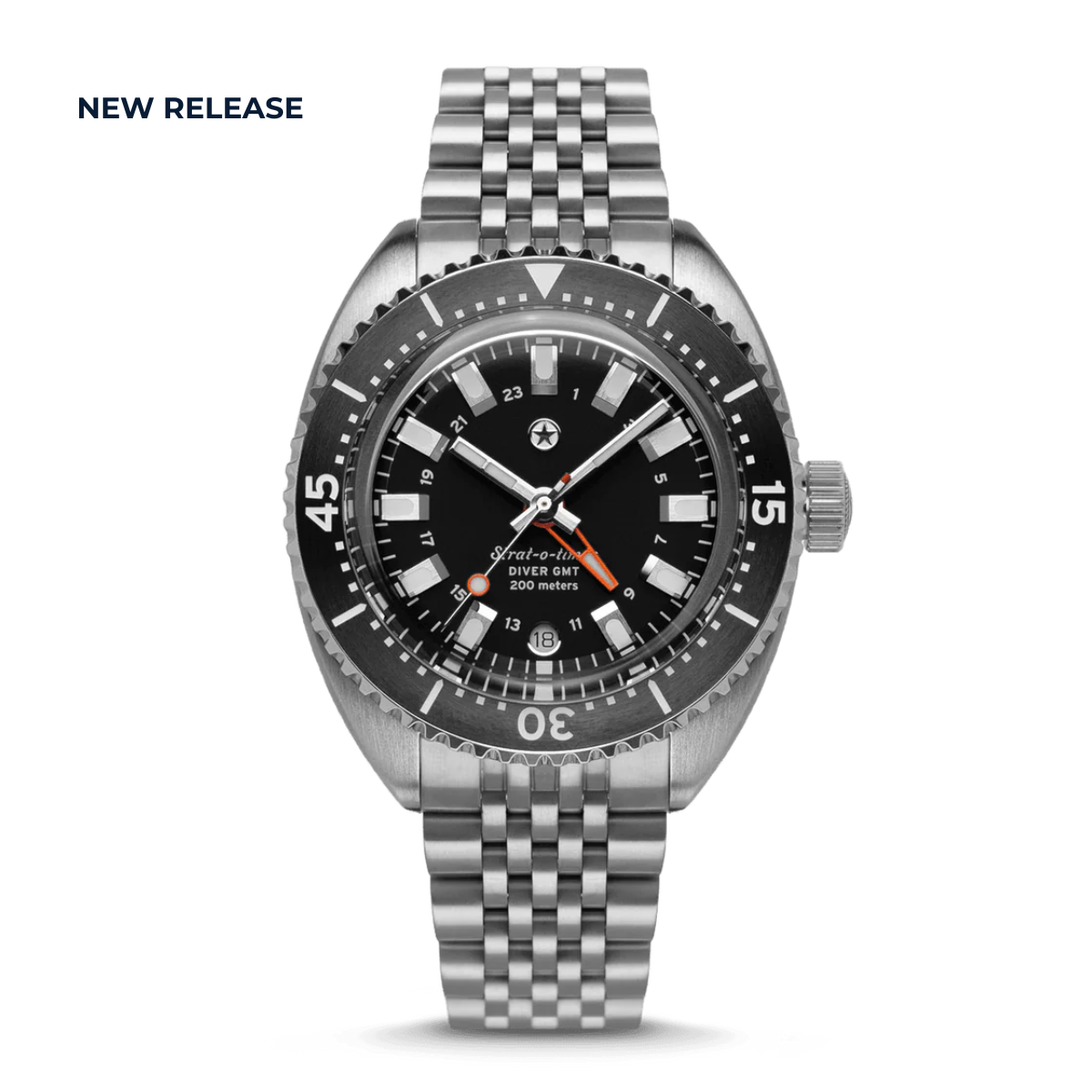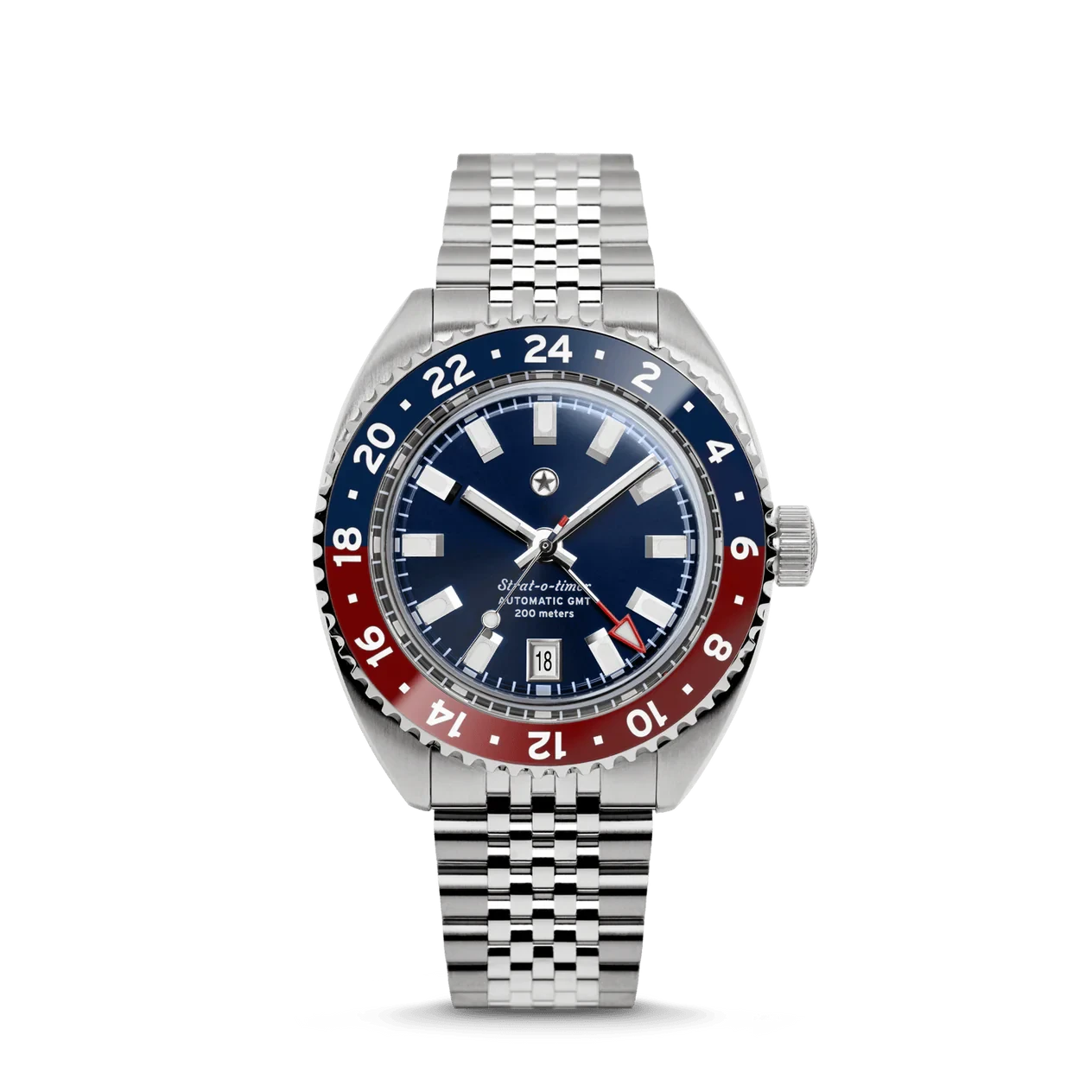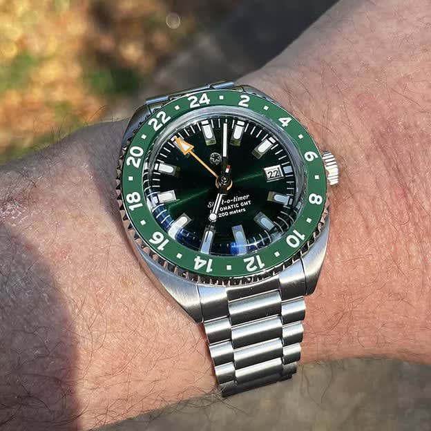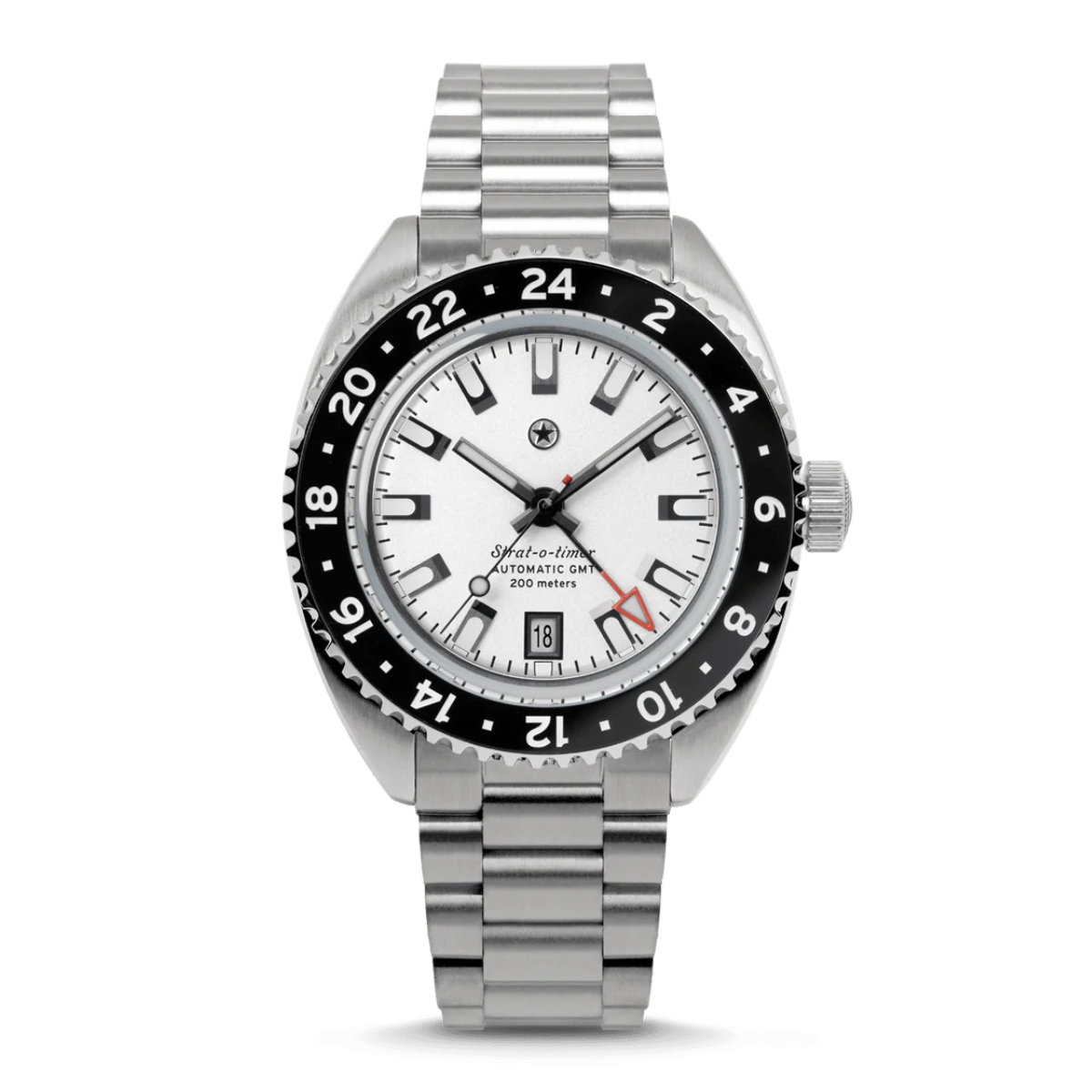 Most GMTs under $1,500 use "caller" movements—you can't adjust the local hour independently. The Strat-o-timer houses the Miyota 9075, a true traveler's GMT with a jumping hour hand. Set your home time on the 24-hour hand, then adjust local time without stopping the watch. The same functionality found in the Rolex GMT-Master II.