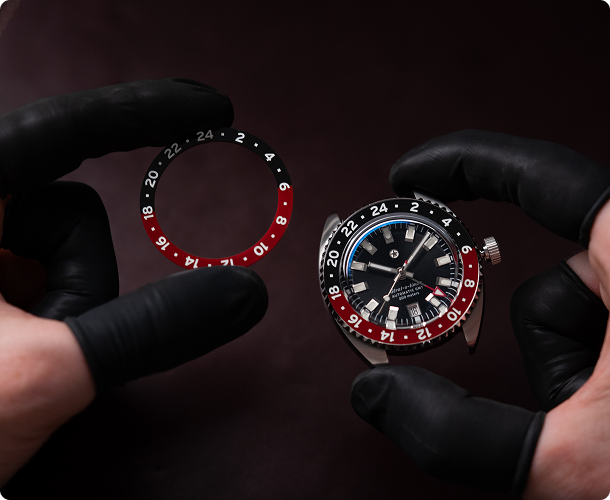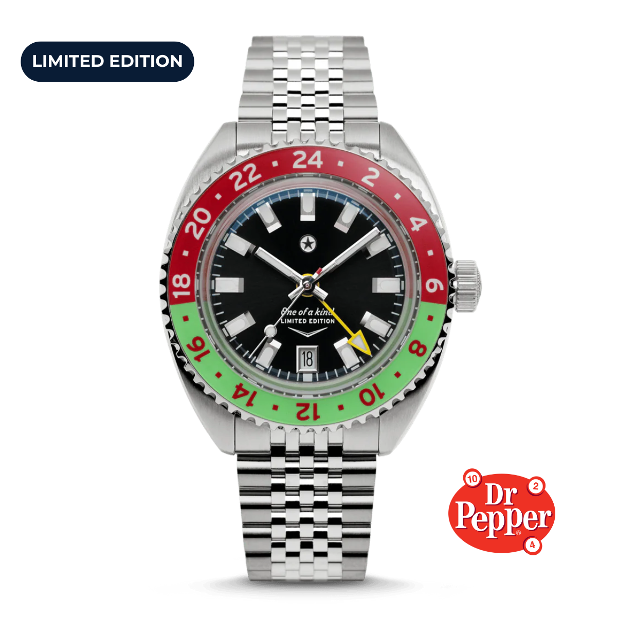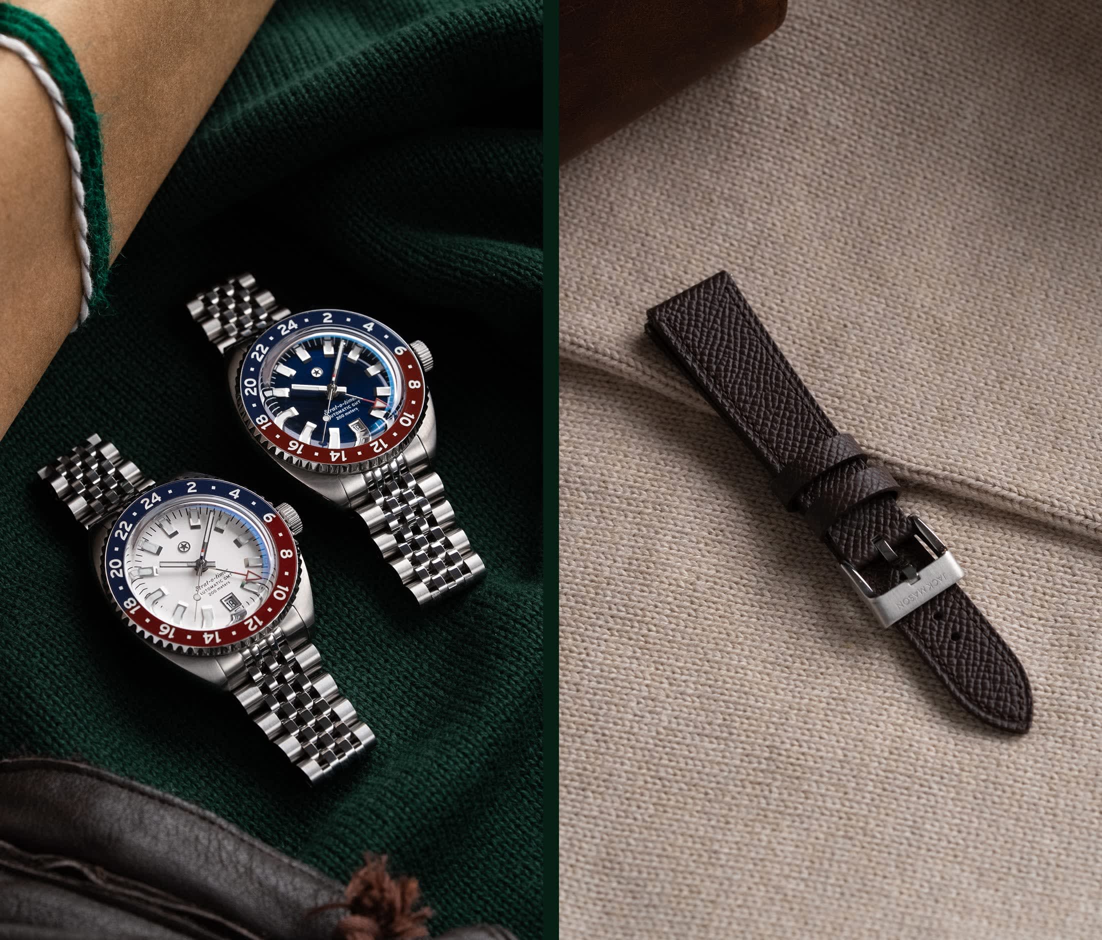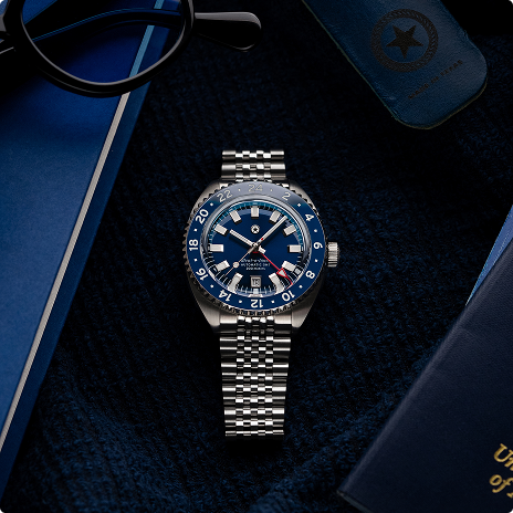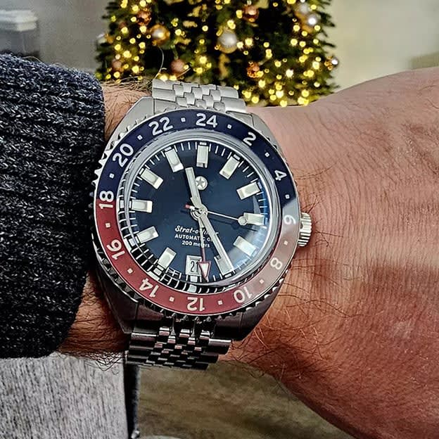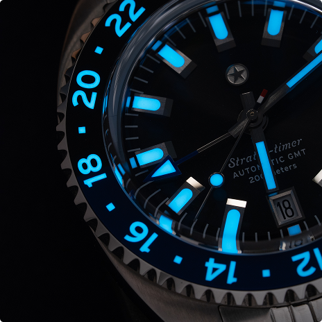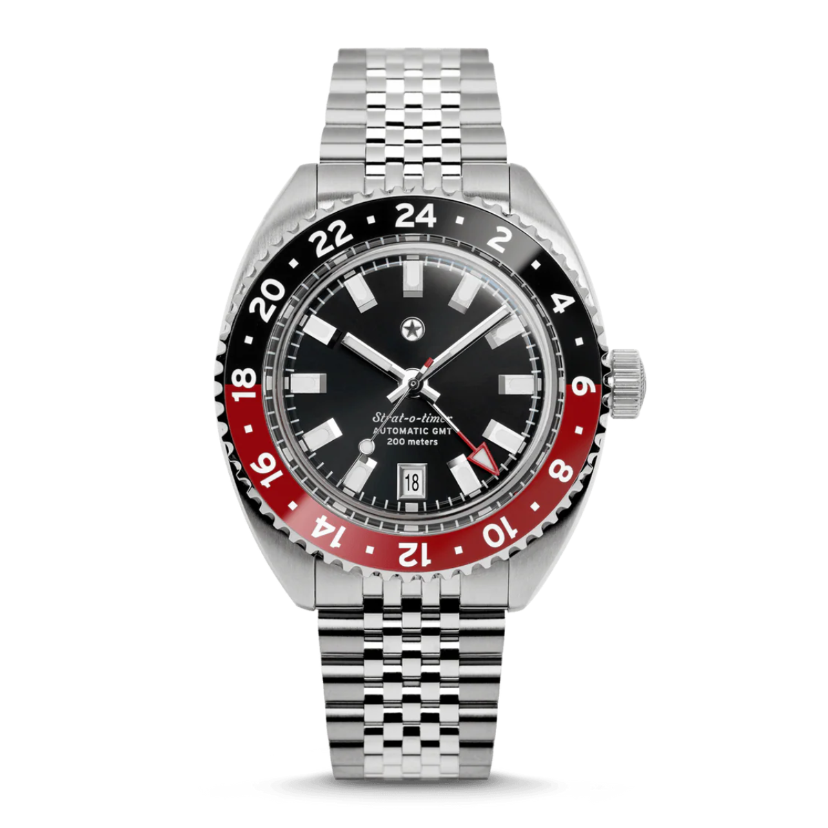 Most GMTs under $1,500 use "caller" movements—you can't adjust the local hour independently. The Strat-o-timer houses the Miyota 9075, a true traveler's GMT with a jumping hour hand. Set your home time on the 24-hour hand, then adjust local time without stopping the watch. The same functionality found in the Rolex GMT-Master II.